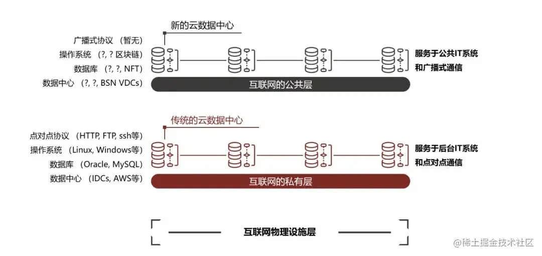因此未来的互联网也会分为两层,一层就是现在的互联网,也可以称为互联网的私有层,服务于目前在世界上占据主流的、由一个实体或一家公司控制的私有IT系统;第二层就是新的互联网公共层,服务于公共信息化系统,对数据的透明性、互通性、所有权以及永续性等要求较高的应用场景都会向互联网公共层迁移或进化。