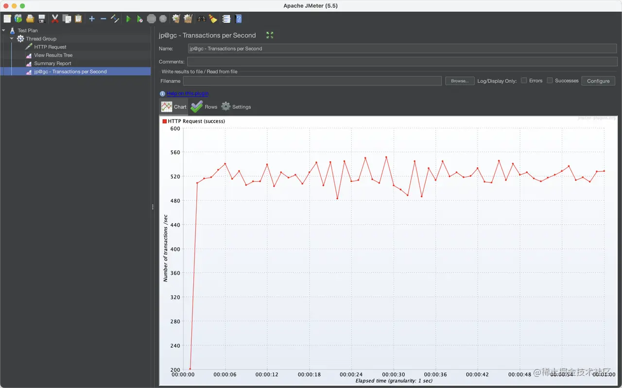 在 JMeter Plugins Manager 安装 “Basic Graphs” 插件,然后在线程组里添加一个 “Transactions per Second ” 监听器。该监听器会显示 TPS 的实时折线图。