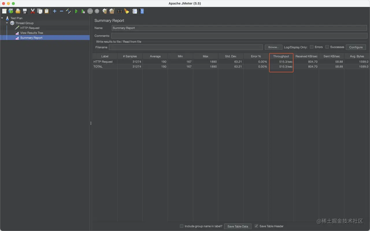 往线程组里添加一个 “Summary Report” 监听器,“Summary Report” 的 Throughput 可以认为是 TPS。