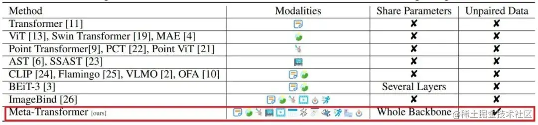 Meta-Transformer 相比同类工作,不依赖配对数据,即可处理更多模态