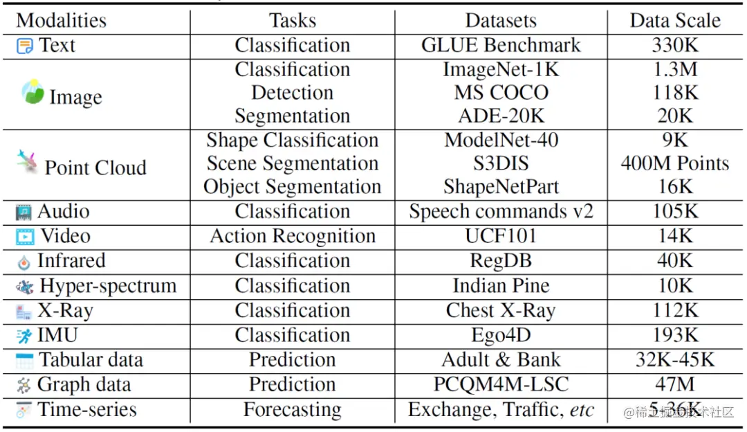 表 2:Meta-Transformer 能处理 12 个模态的 16 个感知任务.