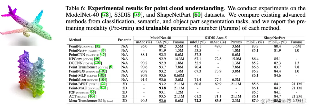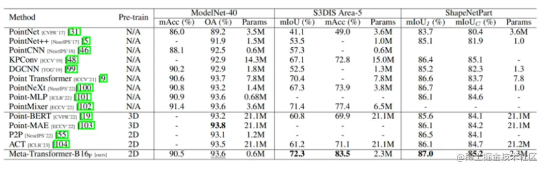 表 4:Meta-Transformer 对于点云理解方面的能力,分别在 ModelNet-40 形状分类,S3DIS 室内场景分割,以及 ShapeNet Part 物体分割任务上进行了评估。