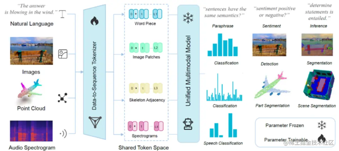 图 2:Meta-Transformer 的框架图:对于不同模态的数据,研究人员基于不同模态的信息特性设计了相应的特征序列构造方式,接着将得到的特征序列输入到预训练后参数冻结的编码器中,由此提取的表征能够在多个模态上解决下游多个任务。2. 无需配对数据:更加灵活的训练方式当前许多模态工作依赖于内容配对