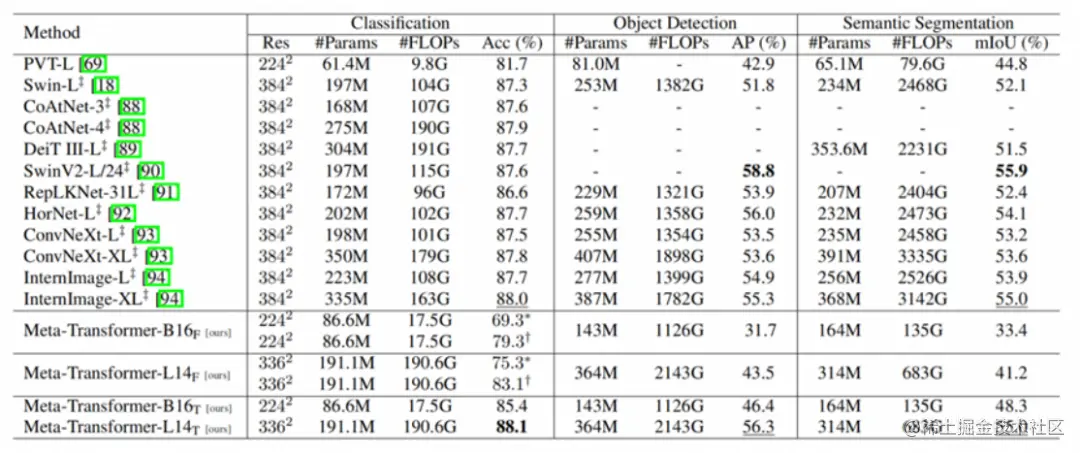 表 3:Meta-Transformer 对于图像理解方面的能力,分别在 ImageNet-1K 图像分类,MS COCO 目标检测,以及 ADE-20K 的语义分割上进行了评估。