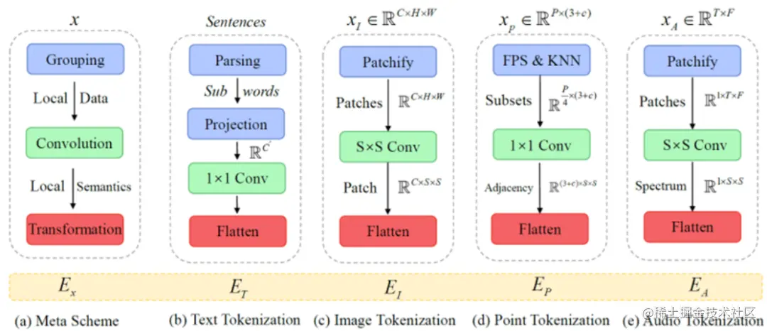 首先,研究人员提出了一套处理多模态数据的核心方案:数据分组 — 卷积提取局部语义 — 语义聚合 —— 空间映射,将各种模态的数据转换为在同一个共享的嵌入空间内的 token 序列。