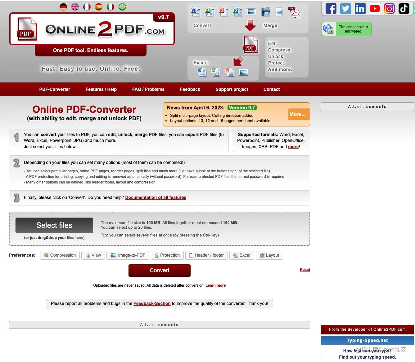ONLINE2PDF是个完全免费的良心线上PDF编辑网站。支持六国语言,可惜不支持中文。目前国内访问正常,功能丰富,操作简便。