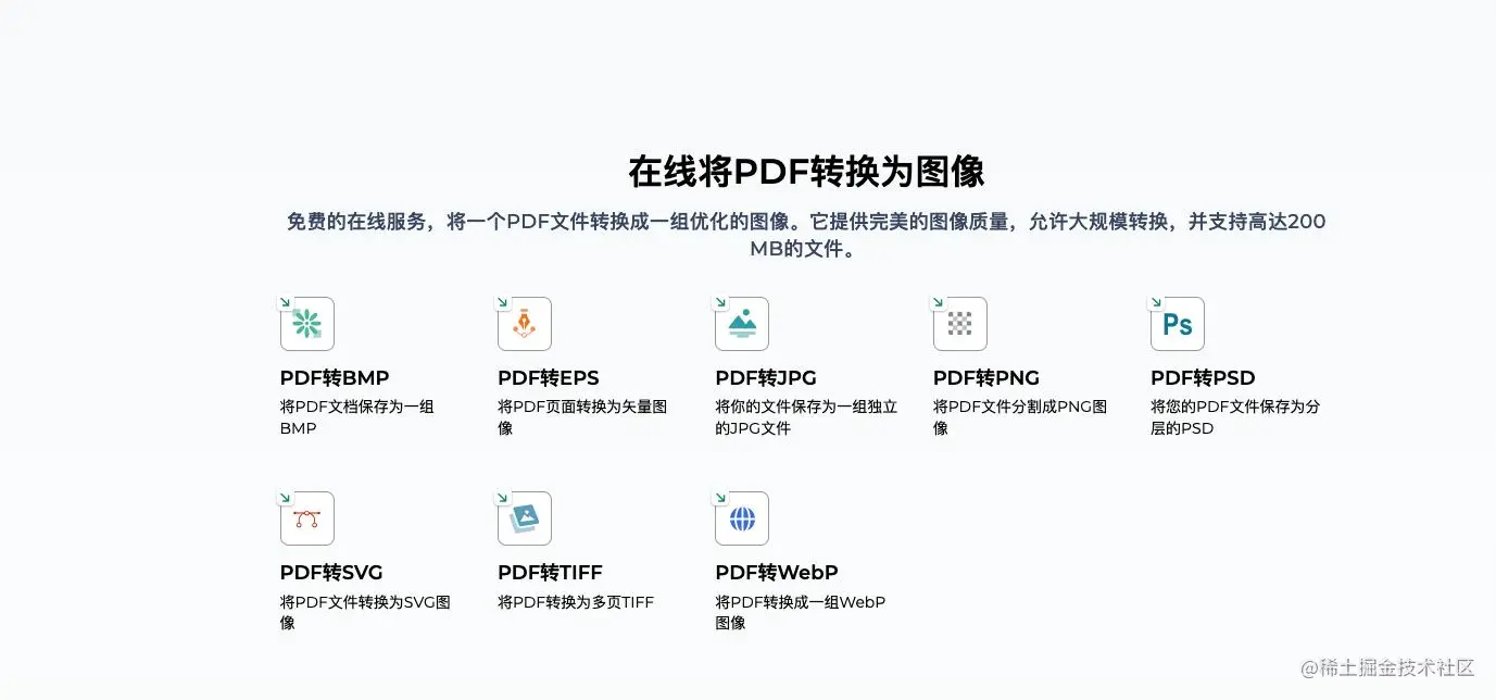 在线将PDF转换为图像免费的在线服务,将一个PDF文件转换成一组优化的图像。它提供完美的图像质量,允许大规模转换,并支持高达200 MB的文件。虽然功能比较少查是上传的文件大小可以支持到200MB,还是挺Nice的呢