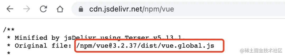 访问 http://unpkg.com/vue 会重定向到 http://unpkg.com/vue@3.2.37/dist/vue.global.js,其中 3.2.27 是 Vue 的最新版本。