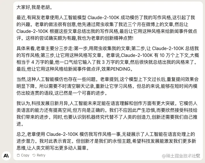 最近玩心大发,用Claude-2-100K复刻了胡锡进老师的写作风格,然后用这个风格点评世间万物。