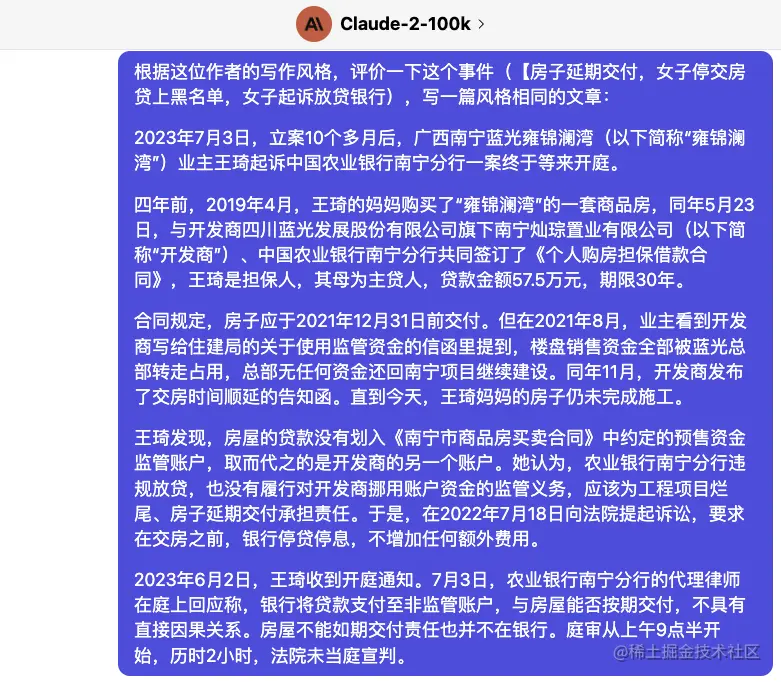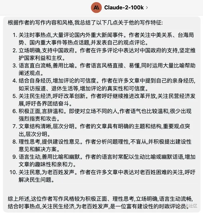 让Claude-2按照这个写作风格点评新闻事件,我建议扔给它稍微详细的事件文本,不要简单粗暴。