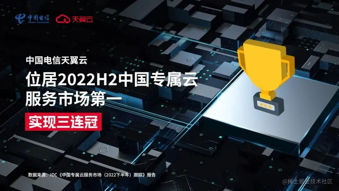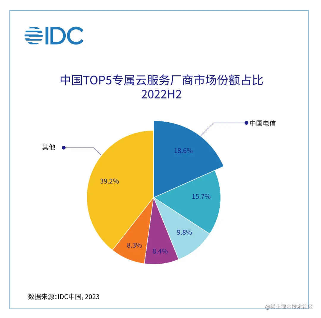 7月24日,IDC发布的《中国专属云服务市场(2022下半年)跟踪》报告显示,2022下半年,专属云服务市场同比增长27.1%,中国电信天翼云以18.6%的市场份额,保持龙头地位。这也是继IDC《中国专属云服务市场(2021下半年)跟踪》《中国专属云服务市场(2022上半年)跟踪》报告之后,中国电信天翼云再次位居榜首。