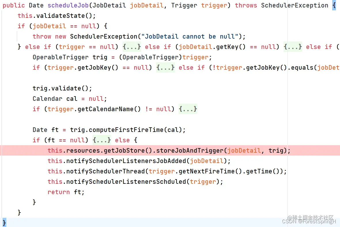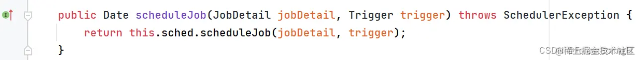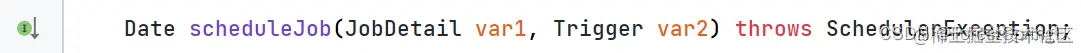 org.quartz.Scheduler类实现的调度任务方法,就是添加计划任务的主要实现代码,笔者点进源码发现以下方法链调用: