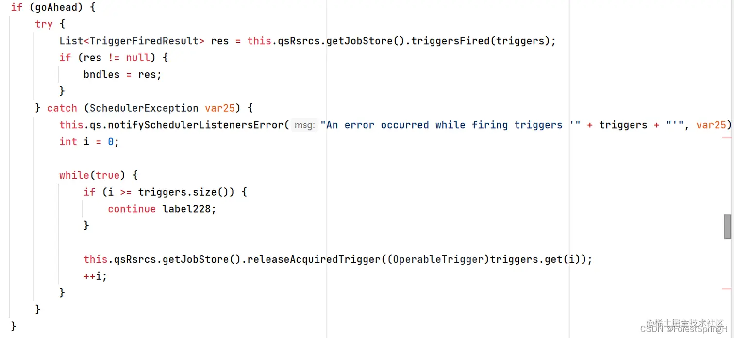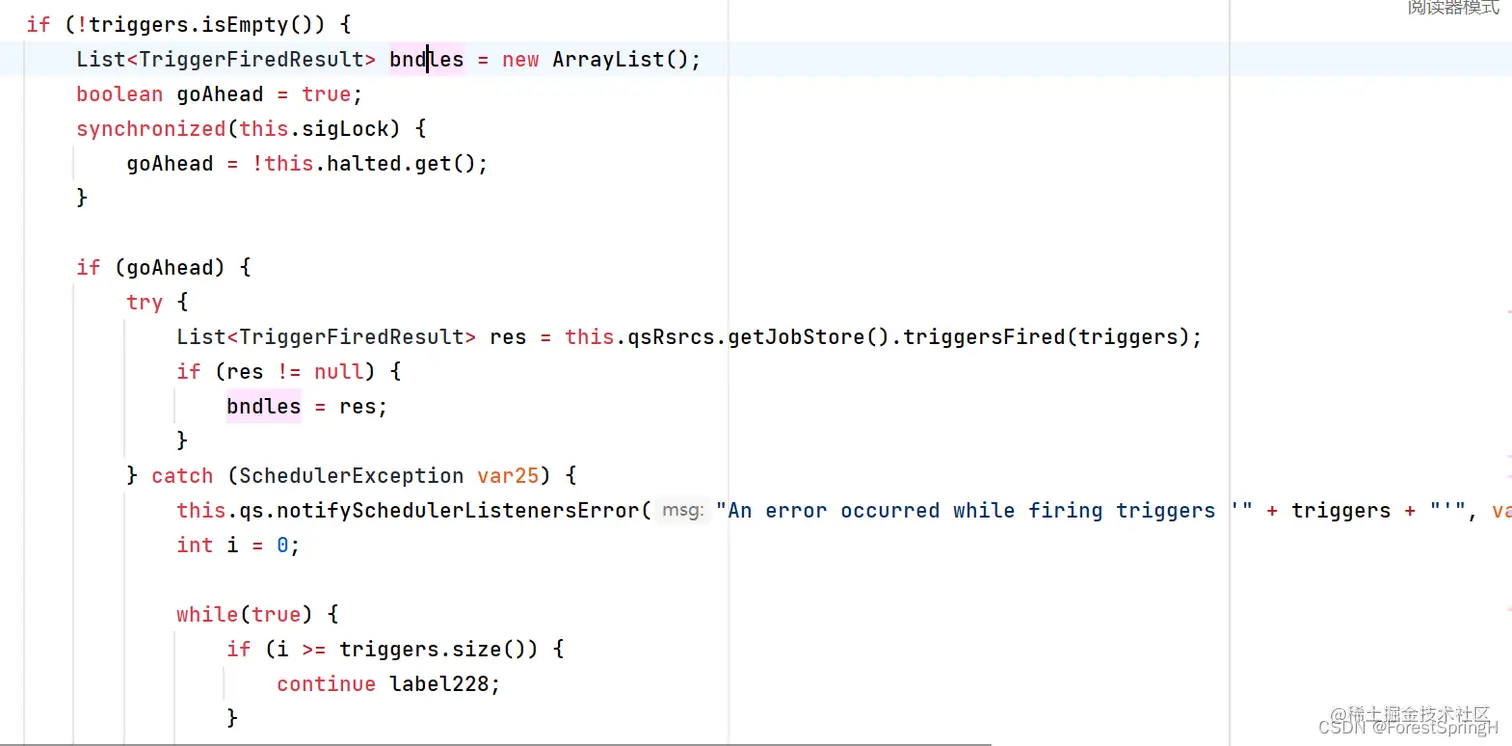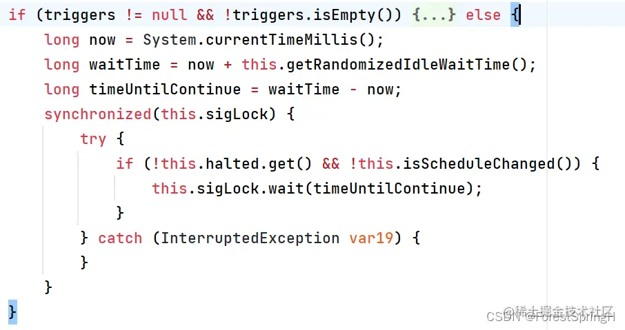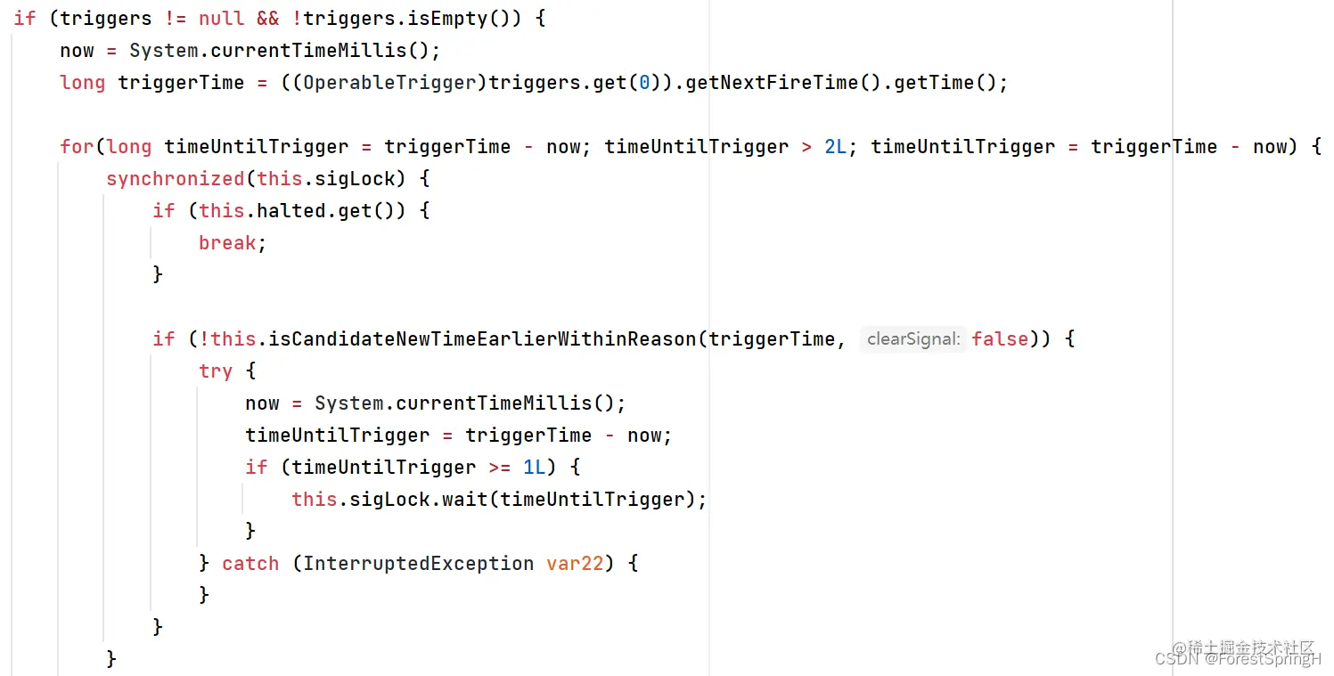 之后就是 判断时间有没有到该触发的时间,因为触发器列表中的触发器都是将要触发的,判断到快要触发了。所以quartz这里做了等待,如果trigger的nextFireTime比当前时间大2ms则循环等待。timeUntilTrigger就是nextFireTime和当前时间之间的差值,它在循环中不断更新,直到它的值非常小了,之后才继续向下到真正的触发代码: