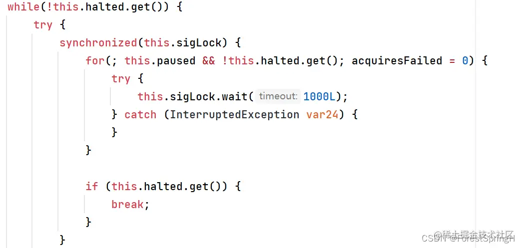 首先在while中优先给出了同步持有对象锁sigLock,通先查询halted的原子布尔型变量的判断,如果停止的值为false则进入等待阶段等到之后进行下一次扫描: