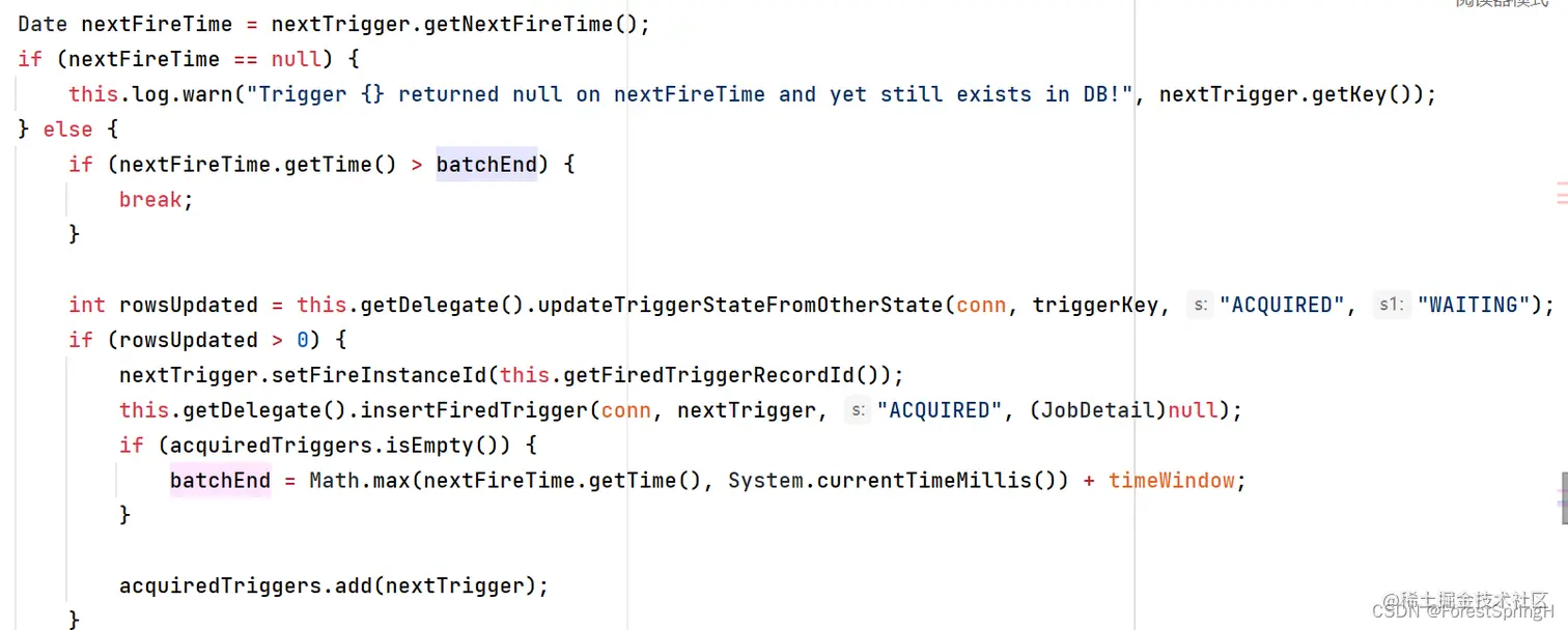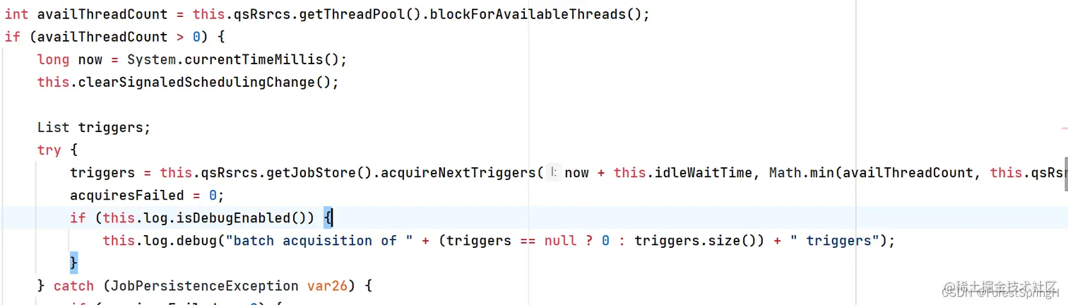 注意方法 this.qsRsrcs.getJobStore().acquireNextTriggers 是获取将要触发的触发器列表: