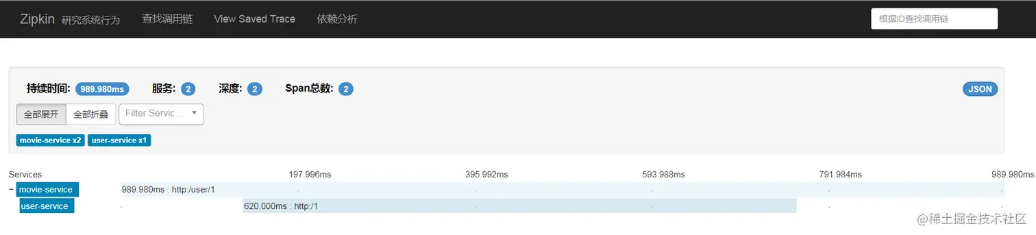 运行顺序:首先运行zipkin-service-server,其次运行user-service-zipkin与movie-service-zipkin,然后访问http://localhost:8010/user/1得到数据结果,最后访问zipkin server首页,填入起始时间、结束时间等筛选条件后,点击Find a trace按钮,可以看到trace列表,如下图所示: