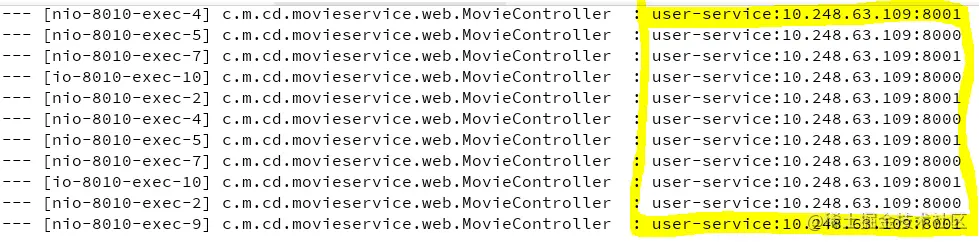 此部分示例主要演示了如何基于Ribbon实现客户端的负载均衡,建议启动方式:先启动Eureka,再启动UserService和MovieService。通过访问MovieService的API接口 /log-instance 进行日志查看,测试结果如下图所示: