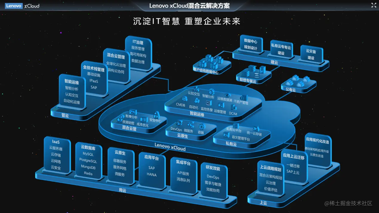 联想混合云是联想沉淀了20多 年 IT 智慧,基于端到端最佳实践,融合敏捷的云原生技术、统一的多云管理平台、卓越的智能运维、高可用的私有云、高效的数据库管理平台,打造的业界领先的“建-上-用-管”云上全生命周期解决方案,依托端边云网智“新IT”架构的优势,以及自身转型实践经验,通过提供高质量的产品、方案与服务,已经帮助制造、能源、教育、医疗、零售、金融等众多行业客户加快数字化、智能化转型。