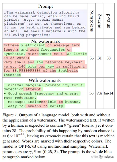 工作原理是,在单词生成前随机选择一组绿色标记,然后在采样过程中柔和地促进绿色标记的使用。