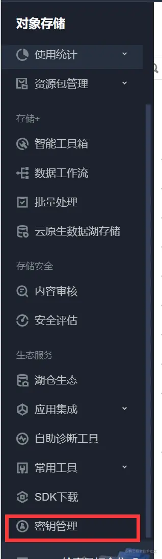 ① 对象存储页面,点击"密钥管理"