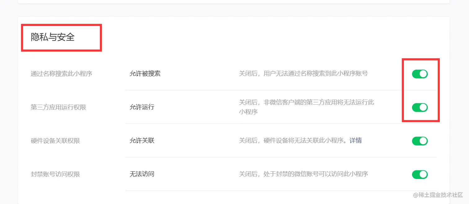 1. 关闭"名称搜索"和"第三方应用运行权限"(小程序后台):