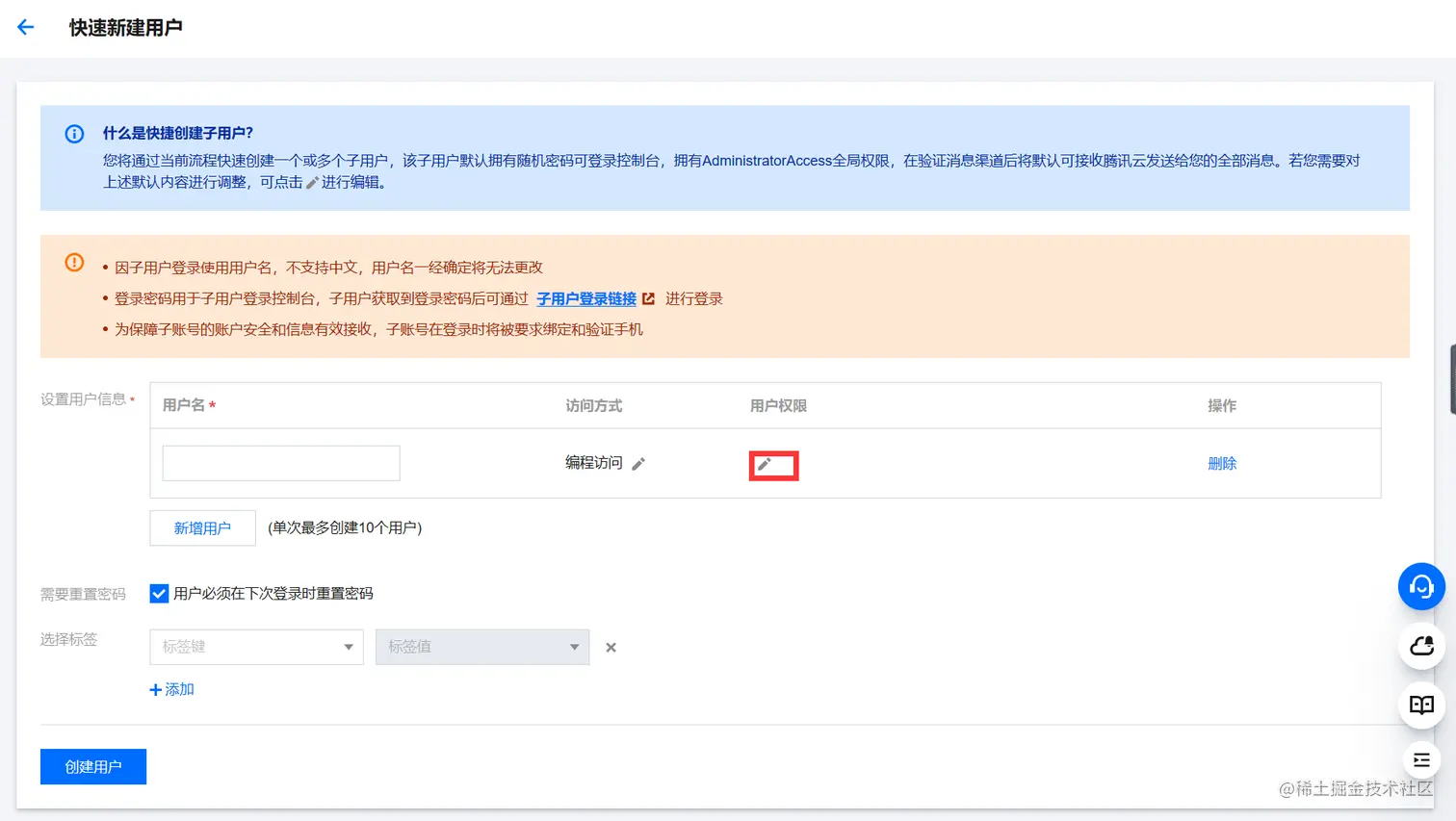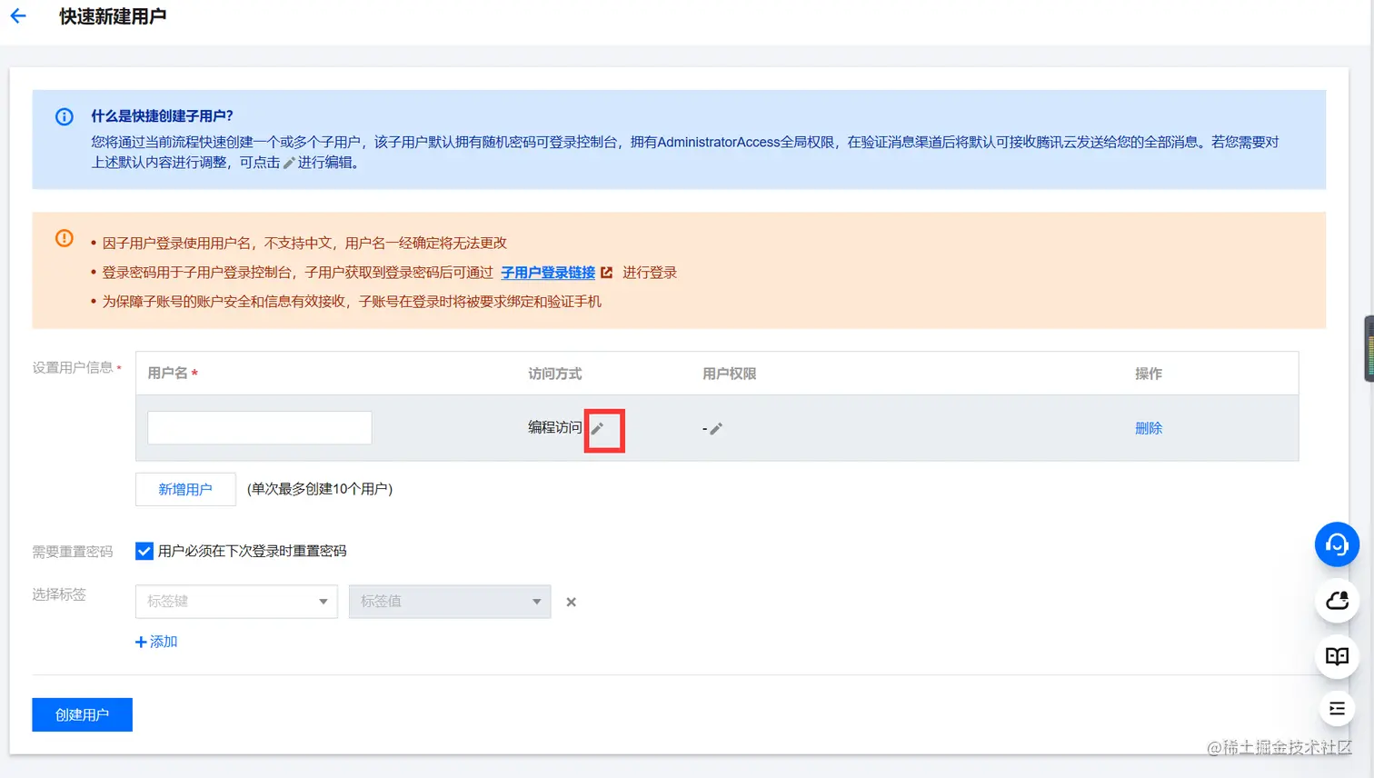 ⑪ 选择刚刚创建的子用户,给予访问权限。