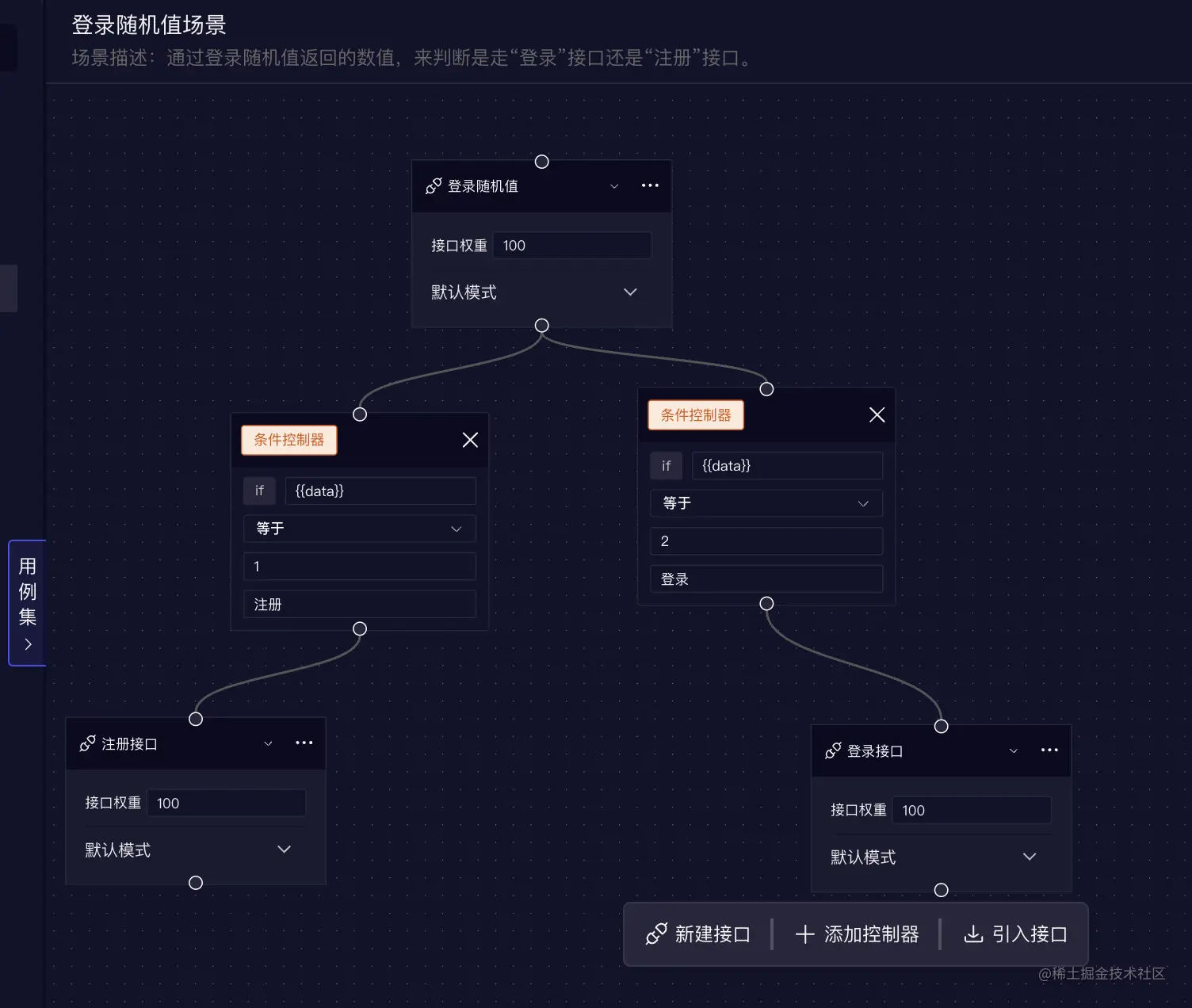 在进行性能测试前,需要定义应用程序或网站的测试场景。这包括模拟真实用户行为、生成大量的虚拟用户等。这一步需要根据实际的业务需求和场景来设计,并且需要结合应用程序或网站的特点进行调整。为了提高测试效率RunnerGo推出的可视化场景配置,通过连接接口方块和条件控制器可以快速配置测试场景。