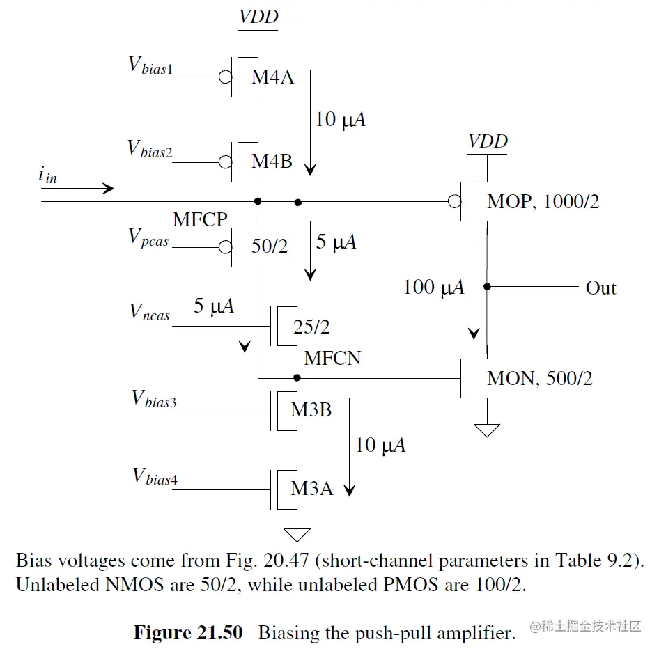 If the input current is positive, the gate of MOP is charged up and thus MOP shuts off. At the same time, MFCP turns on (more), causing the gate of MON to go up, turning it on further. If the input current is negative, MOP turns on and MON shuts off. Iin为正, MOP turns off, MFCP 电流更大, 导致MON开启更大.