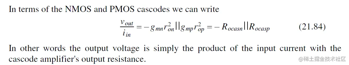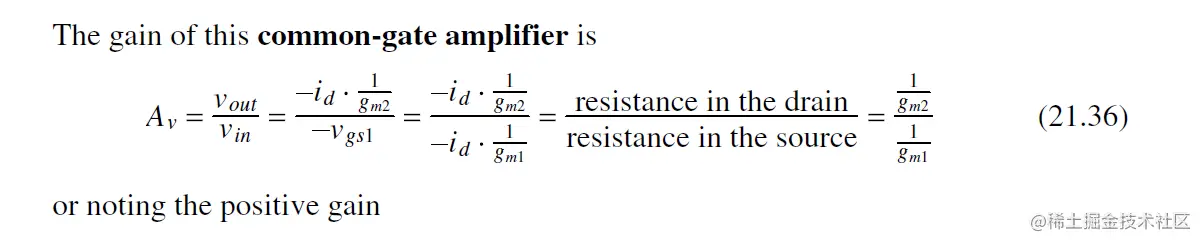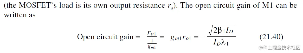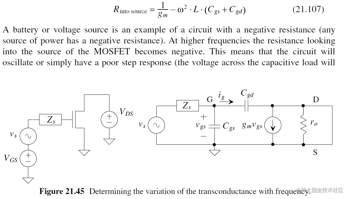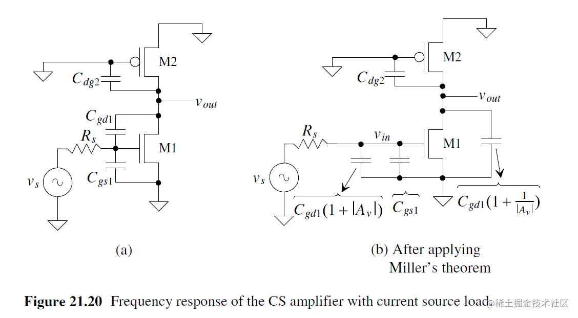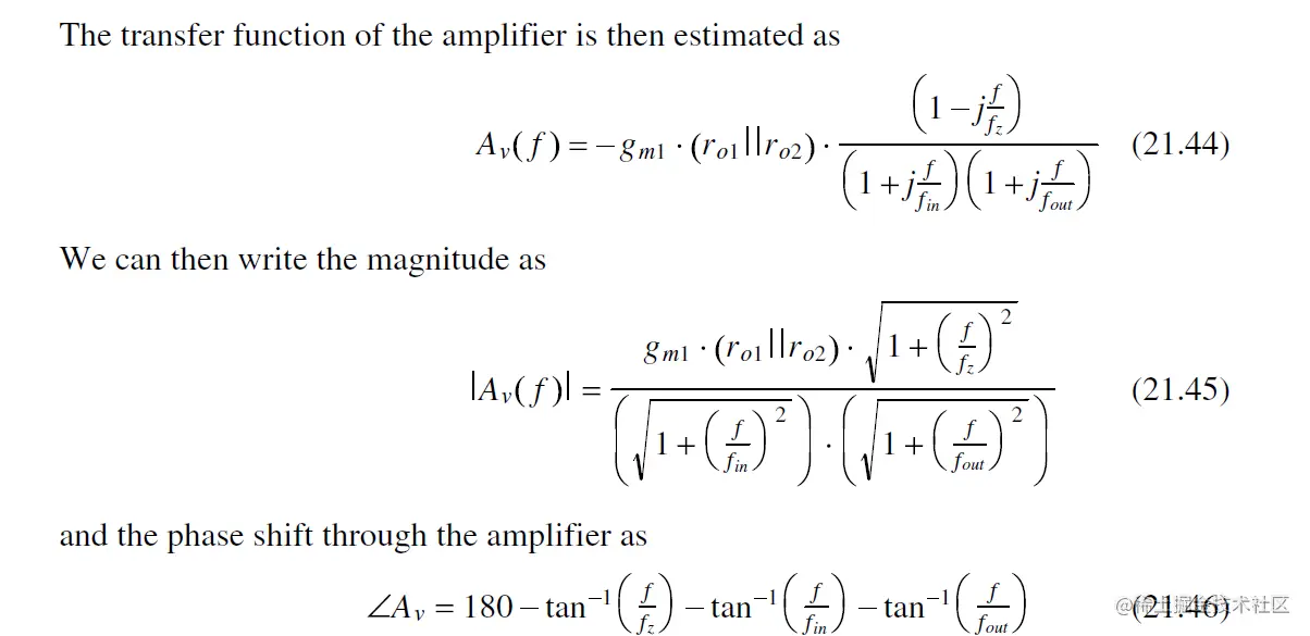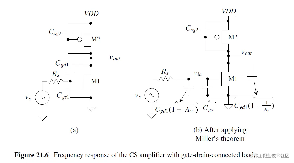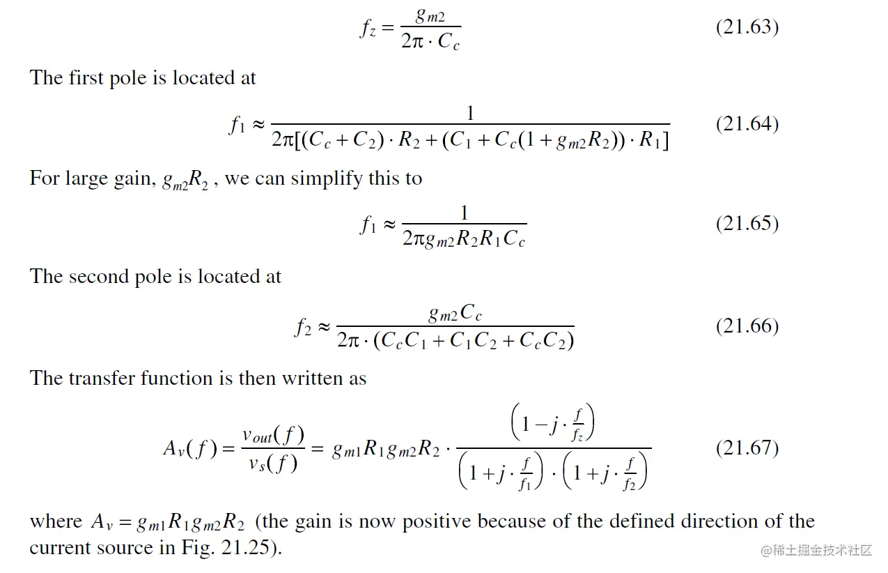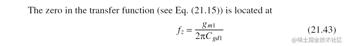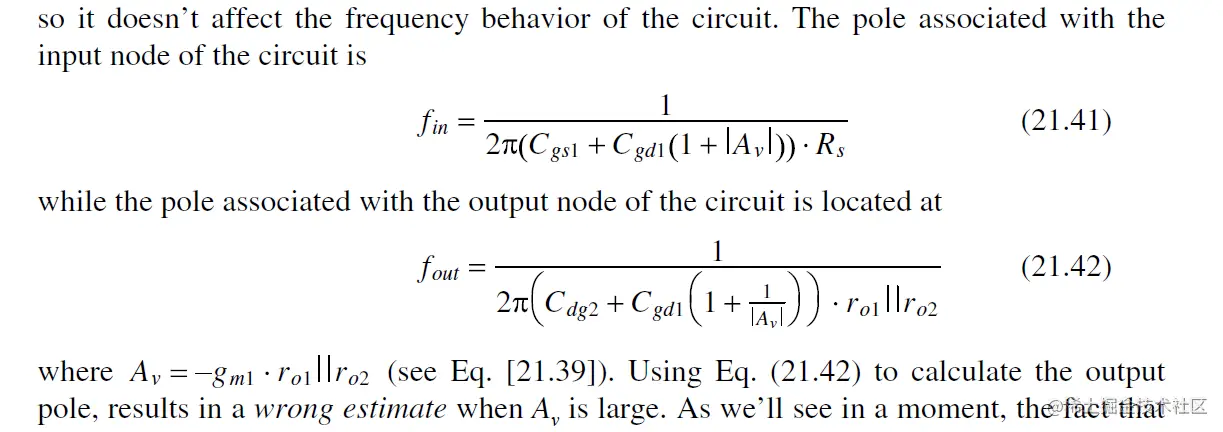 注意 对于fout, Cgd的引入导致Av下降, 产生 极点分离 (pole splitting), 即output实际的极点 pole会比预测的fout (Eq. 21.42)值大得多.