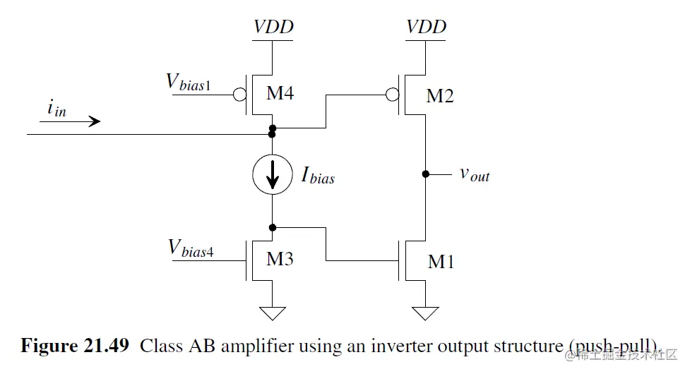 当输出需要 rail to rail (VDD to GND)时, 需采用Class AB- push pull amplifier. Im2 mirror Im4, Im1 mirror Im3. Ibias为floating current source.