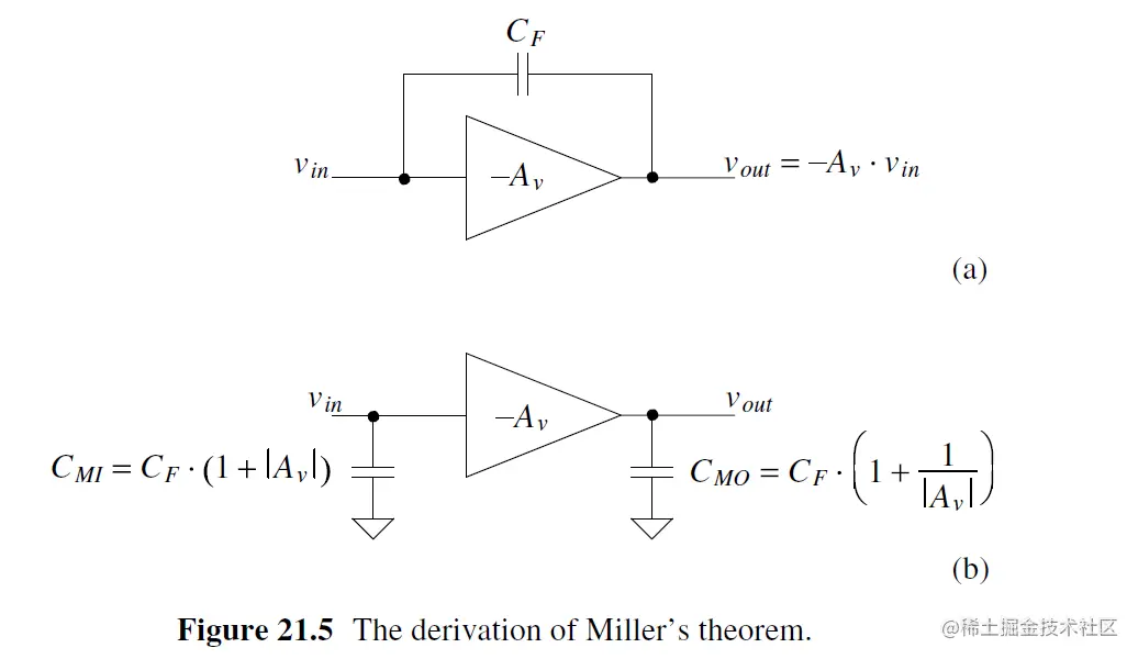 定性理解为effective voltage across CF is Av + 1 times larger than the input signal itself. This large voltage drop across CF (one side going up by vin while the other side goes down by ) results in Av vin a large displacement current, which makes the capacitor appear larger than it really is. Cf两端电压差变大Av倍, 等效为电流变大, 电容变大.