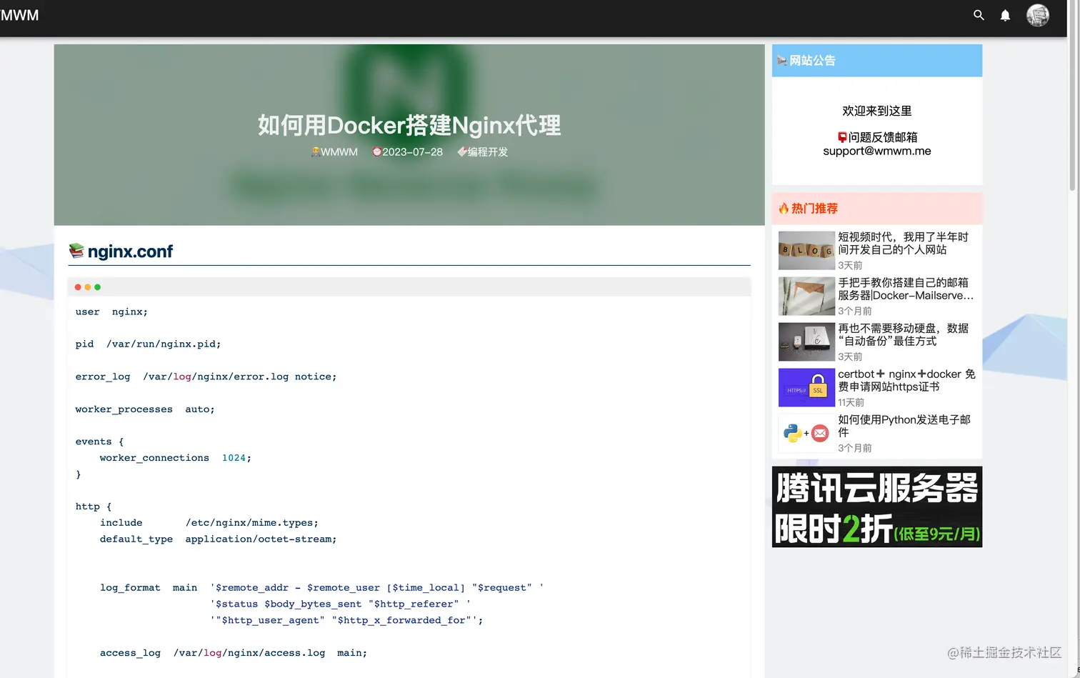 --name容器名字--restart总是重启--network设置为host模式,方便nginx进行端口转发,如果不用host模式,在nginx容器内部做端口转发,就比较麻烦,需要知道每个容器的IP地址才行-e设置环境变量,将时区设置成Asia/Shanghaifullchain.pem和privatekey.pem是ssl证书,从注册域名的网站可以获取nginx.confnginx的端口转发配置文件nginx_logrotate.conf日志轮转,达到定期清理日志的作用nginx_logs日志文件夹,方便查看日志