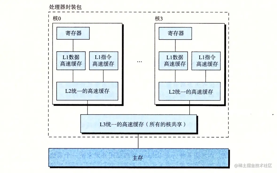 多核处理器是将多个 CPU (称为“核”)集成到一个集成电路芯片上(下图为多核处理器的组织结构):