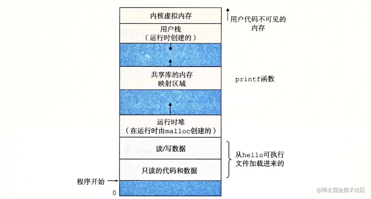 - 内核虚拟内存:地址空间顶部的区域是为内核保留的。不允许应用程序读写这个区域的内容或者直接调用内核代码定义的函数。相反,它们必须调用内核来执行这些操作。虚拟内存的运作需要硬件和操作系统软件之间精密复杂的交互,包括对处理器生成的每个地址的硬件翻译。基本思想是把一个进程虚拟内存的内容存储在磁盘上,然后用主存作为磁盘的高速缓存。
