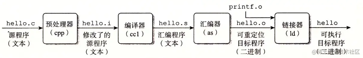 - 预处理阶段:预处理器( cpp )根据以字符#开头的命令,修改原始的 C 程序。比如 hello.c 中第1行的 #include <stdio.h> 命令告诉预处理器读取系统头文件 stdio.h 的内容,并把它直接插入程序文本中。结果就得到了另一个 C 程序,通常是以 .i 作为文件扩展名。
