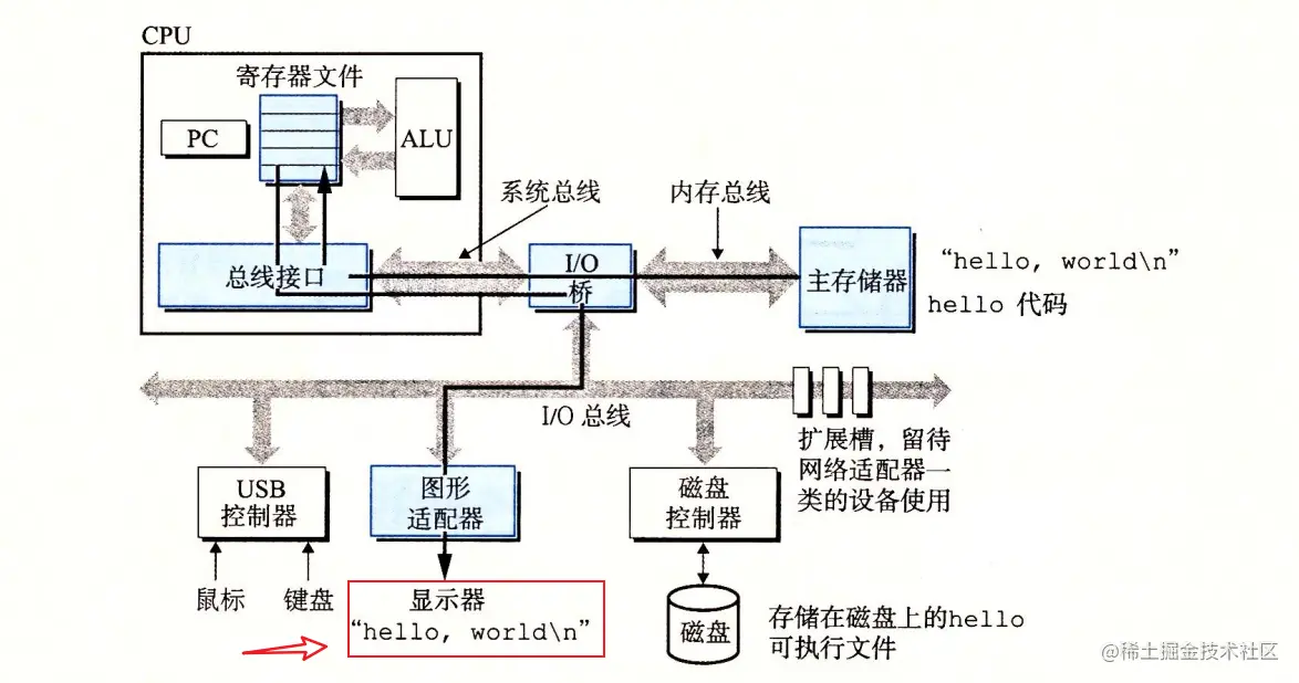 - 最开始,可执行程序 hello 就存放在磁盘上。