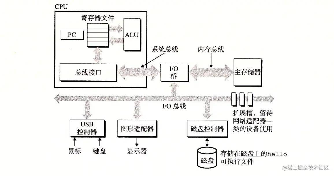 为了理解运行 hello 程序时发生了什么,我们需要了解一个典型系统的硬件组织。