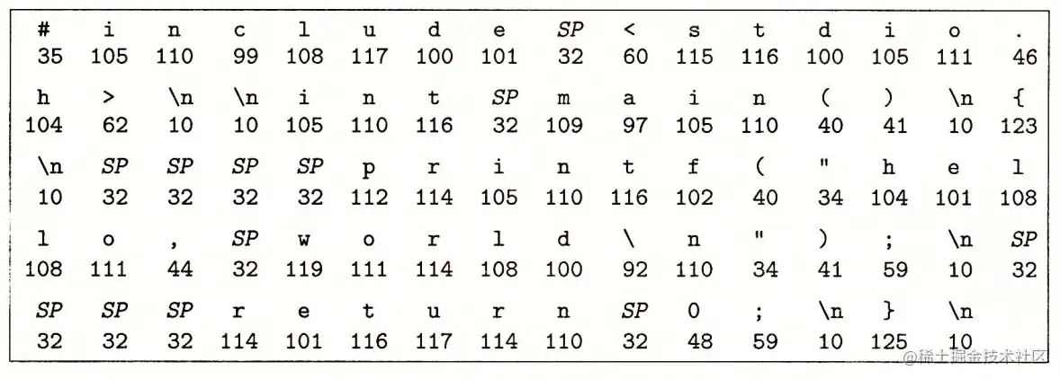 - 下图给出了 hello.c 程序的 ASCII 码表示: