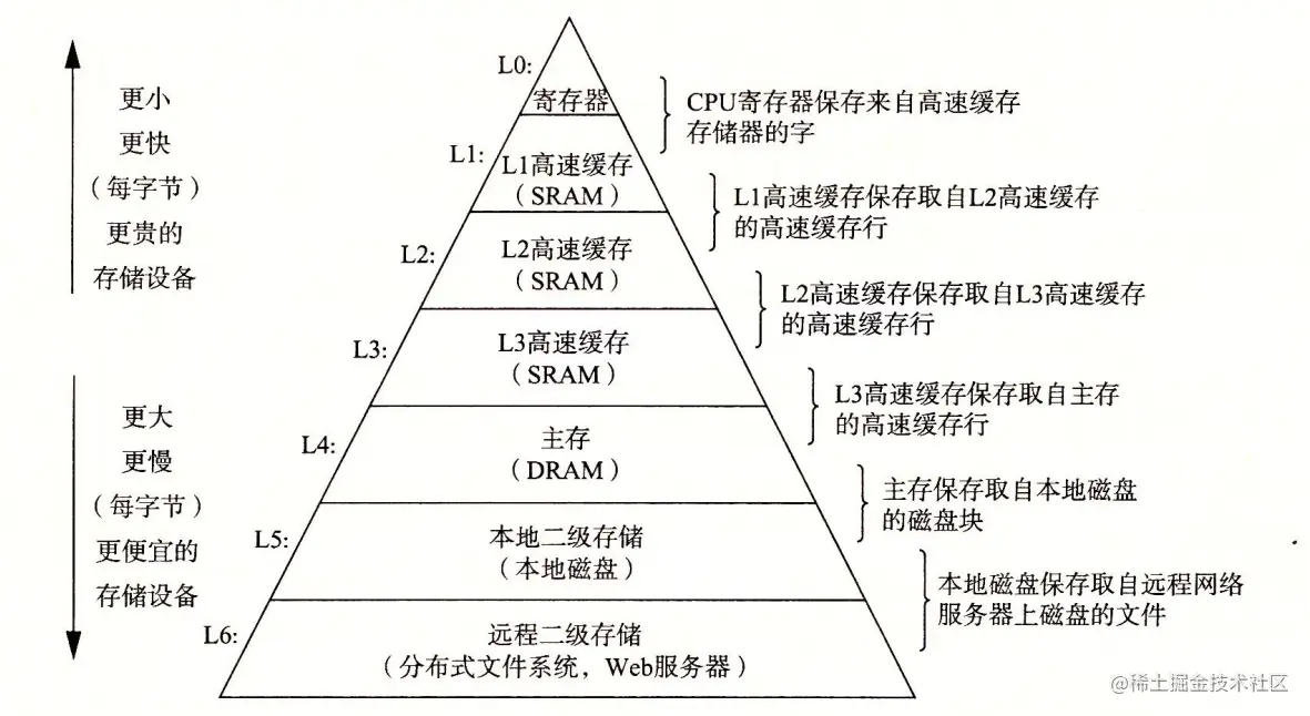 实际上,每个计算机系统中的存储设备都被组织成了一个存储器层次结构。