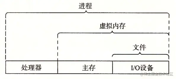 - 文件是对 I/O 设备的抽象,虚拟内存是对程序存储器的抽象,而进程是对一个正在运行的程序的抽象。