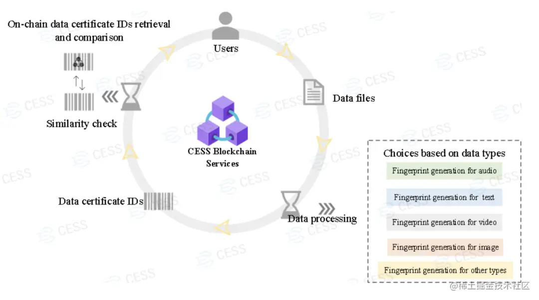 **CESS 用户首先通过数字指纹机制对数据文件进行处理,**提取其数据指纹。不同类型的数据采用不同的数字指纹算法,确保指纹提取的准确性和有效性——