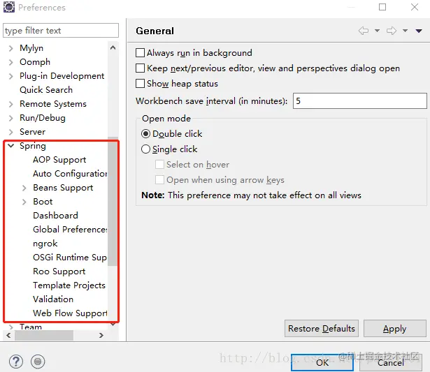 重启之后,我们进入到 Eclipse-->Windows --> Preferences下,会看到有个spring模块,此时就代表,spring boot 插件安装成功。