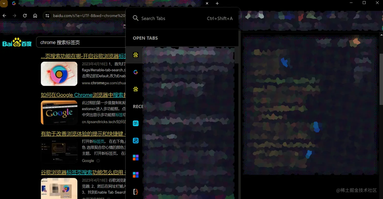 还可以右键顶部任意位置打开。原本右键顶部,一般是打开标签页的菜单,复制标签页之类,一般不是很常用。于是,可以将右键最顶部改成打开 “搜索标签页” 界面,效果还行,截图如下: