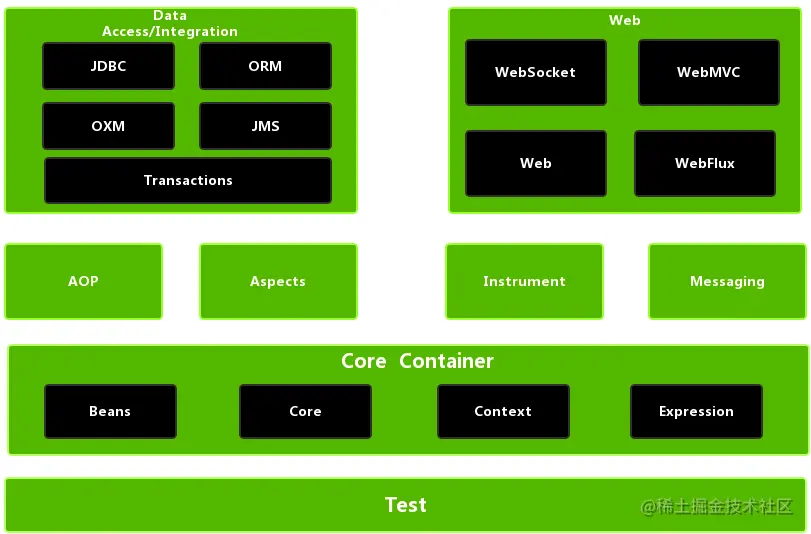 Web层由Spring-web、Spring-webmvc、Spring-websocket和Portlet模块组成。