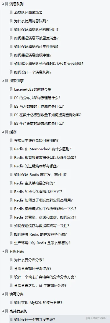 宝典从Java进阶面试常问5大模板(高并发架构,分布式系统、高可用架构、微服务架构、海量数据处理)逐一展开,内容覆盖消息队列,搜索引擎,缓存,分库分表,读写分离,分布式锁,分布式事务,限流,熔断等核心知识,内容太多我就不在此一一展开了,