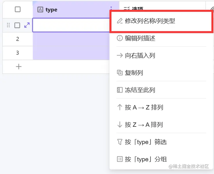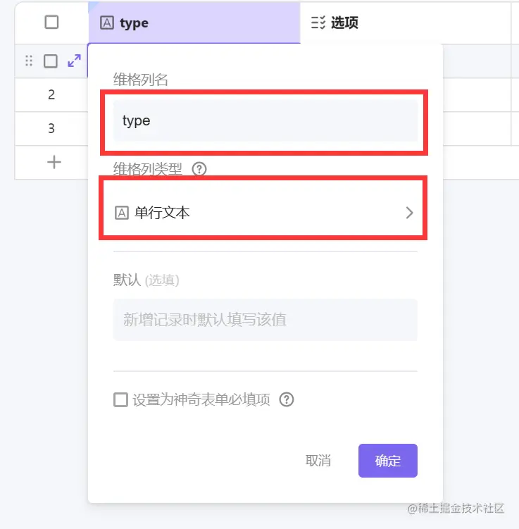 第一列,名称设置为"type"、类型设置为"单行文本":