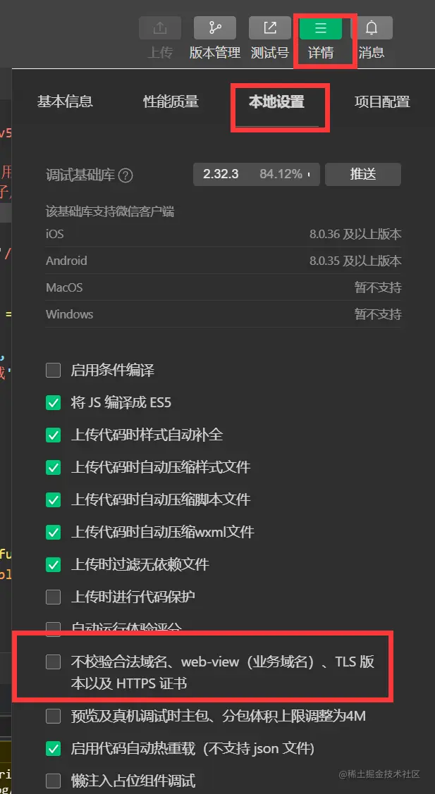 4. 先勾选'不校验合法域名'运行小程序,进行测试: