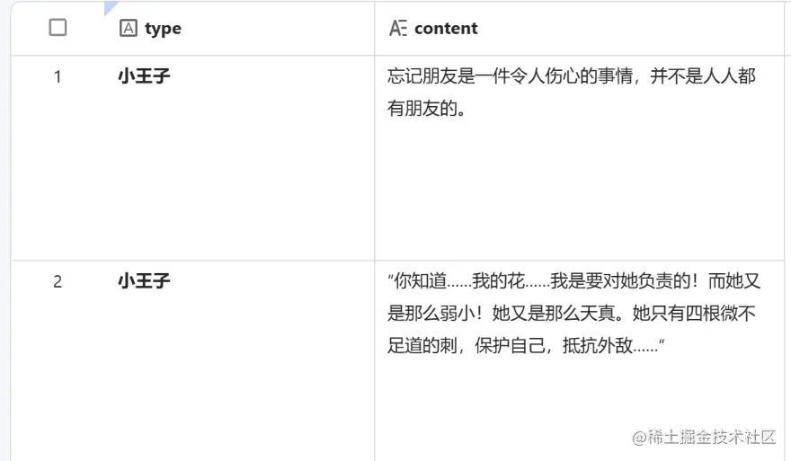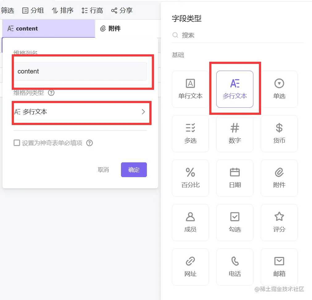 第二列,名称设置为"content"、类型设置为"多行文本":