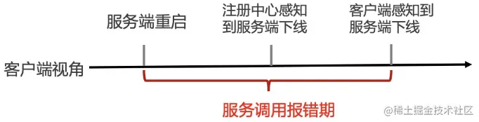 但是在服务端重启开始拒绝客户端新的请求的时刻开始,即执行了Connectors.stop开始,到客户端感知到服务端该实例下线这段时间内,客户端向该实例发起的所有请求都会被拒绝,从而引起服务调用异常。