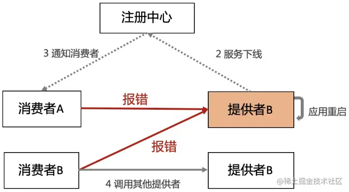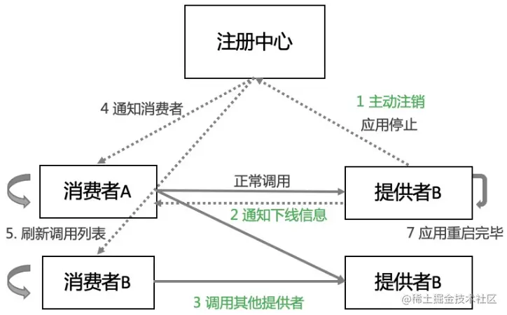 - 注册中心则将通知消费者,其中的一个服务提供者节点已下线。这个过程包含推送和轮询两种方式,推送可以认为是准实时的,轮询的耗时由服务消费者轮询间隔决定,最差的情况下需要 1 分钟。
